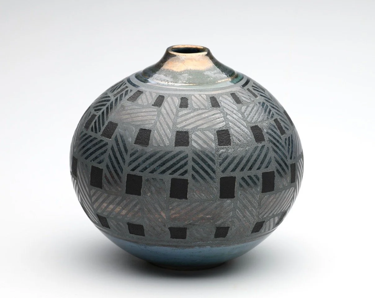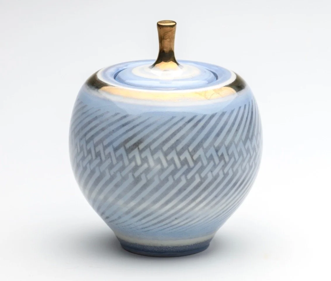 Stoneware, sandblasted denim glaze, gold and opal lustre, black stain inlay, multiple firings