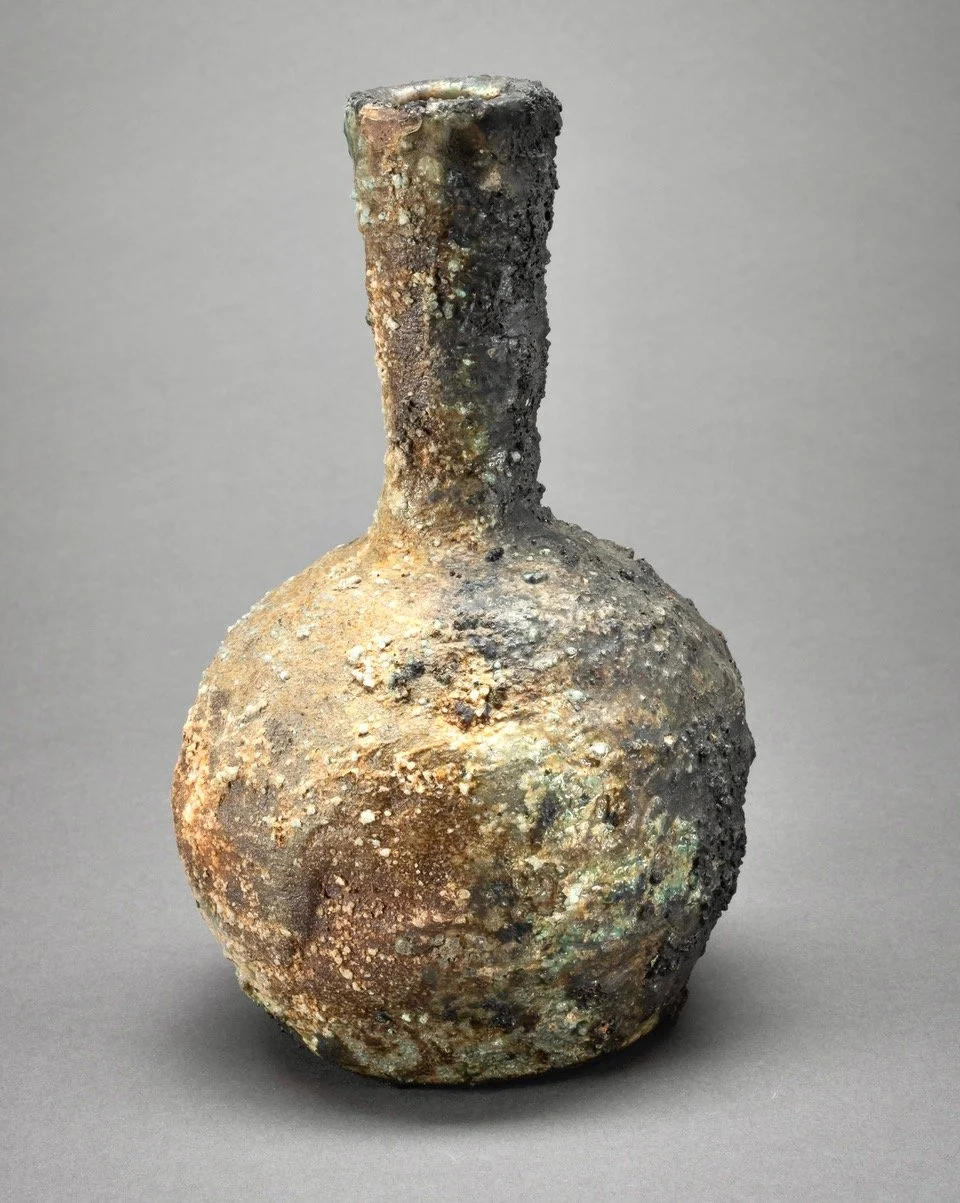 The slabs are formed by pressing clay onto a flat surface and the constructed pieces assembled by hand to complete the bottle form