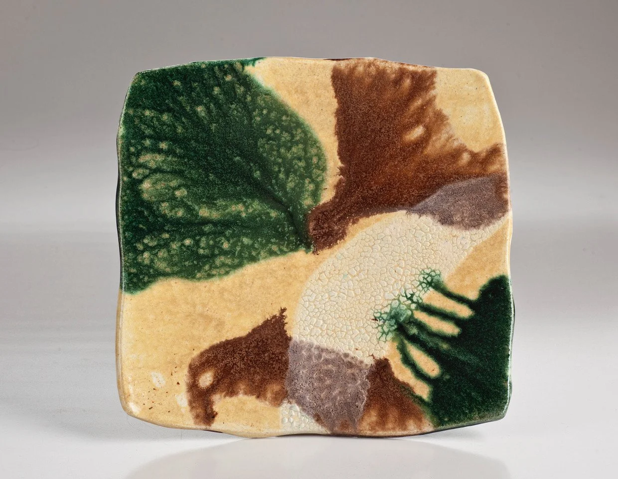 Irregular, footed, ceramic plate, multi-glazed, mid-fired