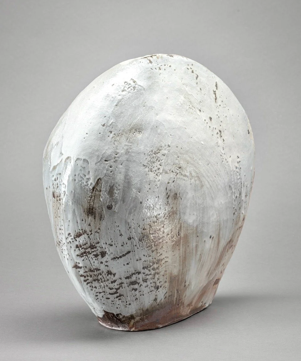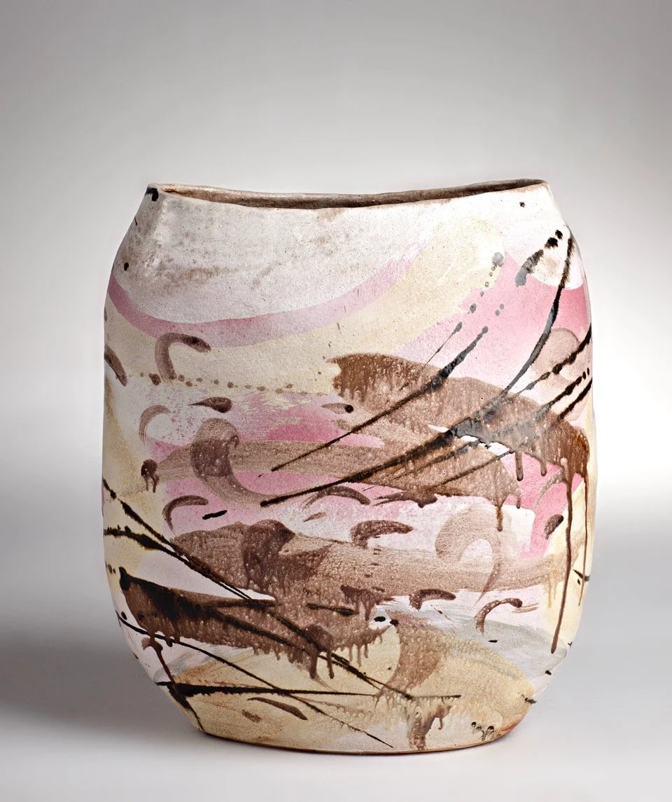 Open-necked, hand-built, ceramic elliptical form, multi-glazed and multi-fired