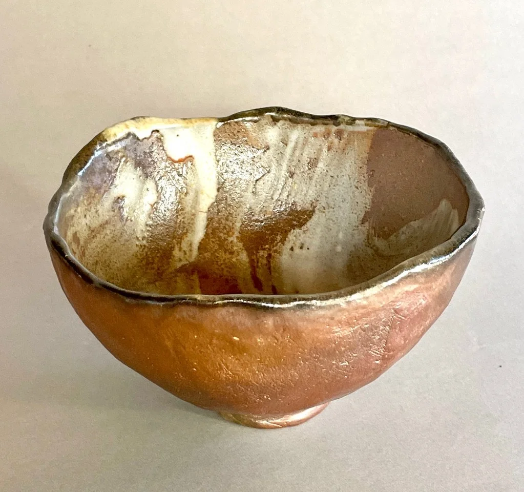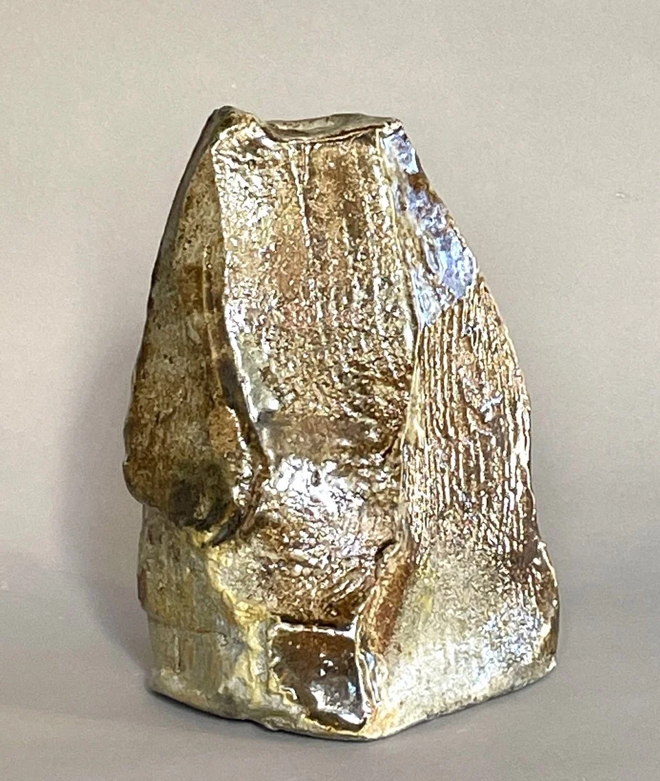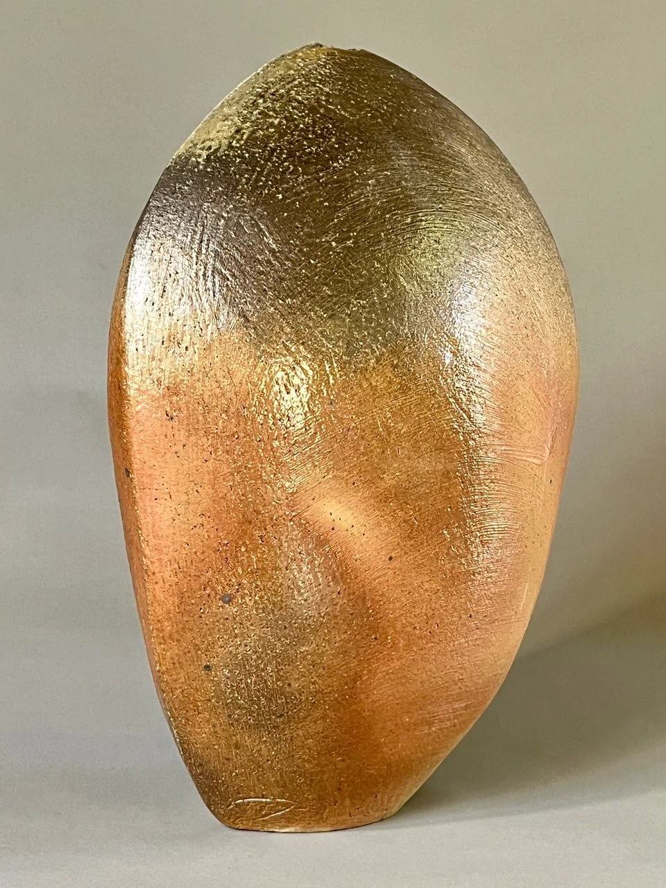 Manganese clay, thin shino glaze, natural ash glaze, resulting in a gold colour near the opening