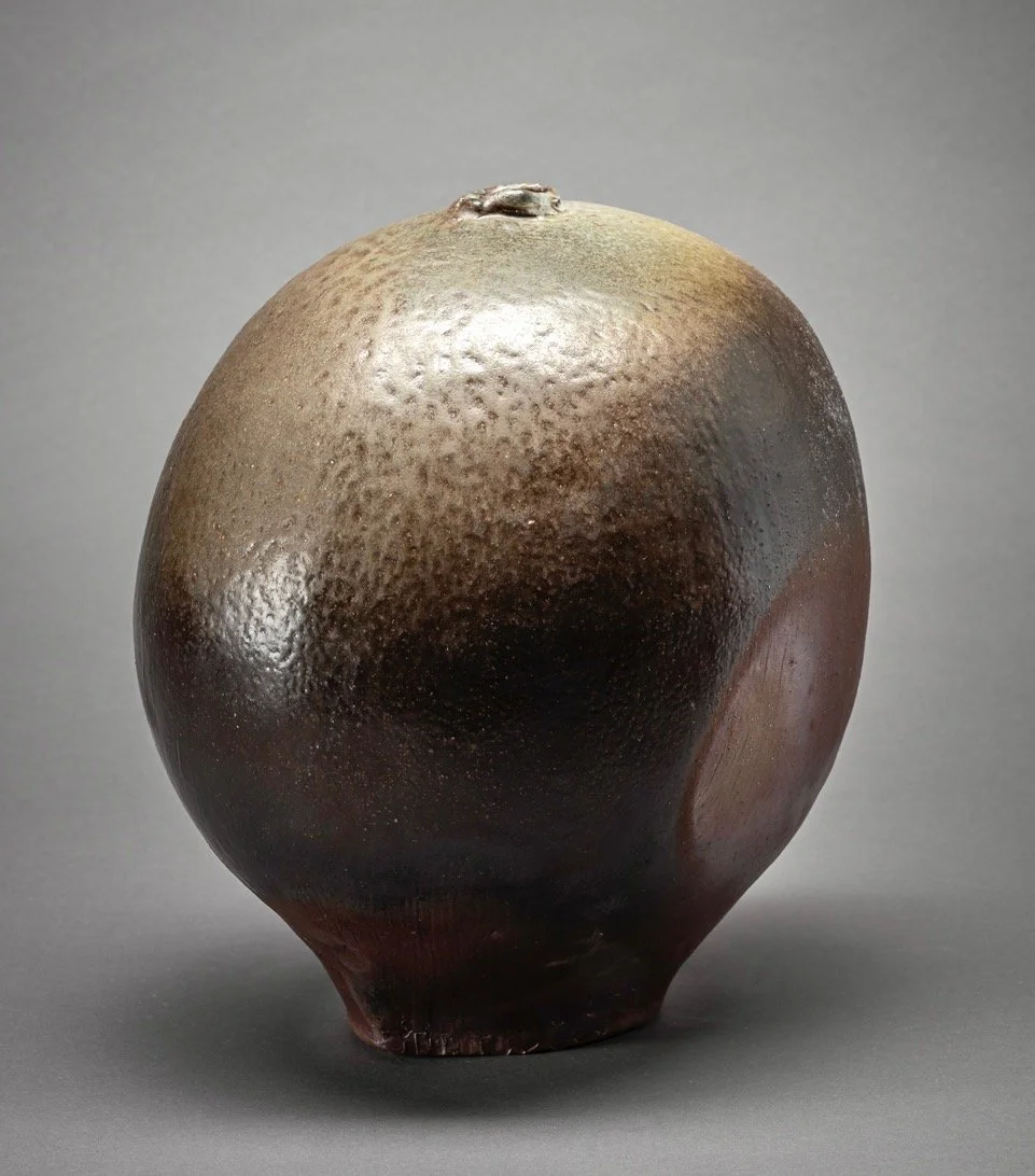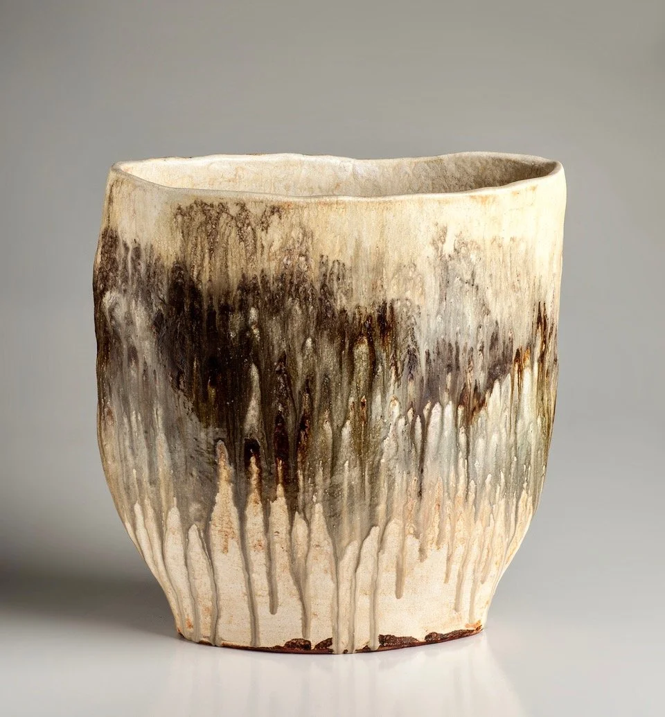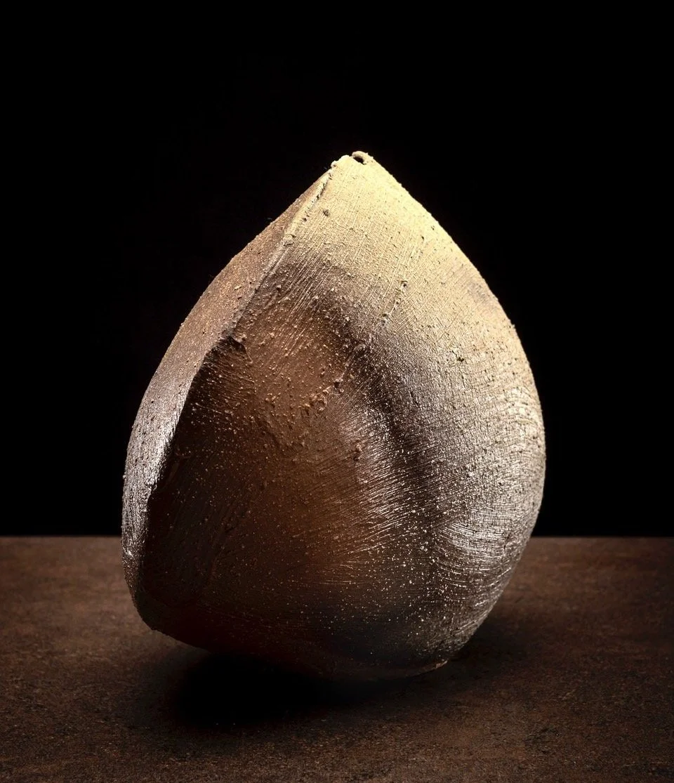 Manganese clay, thin shino glaze, natural ash glaze, resulting in a gold colour near the opening