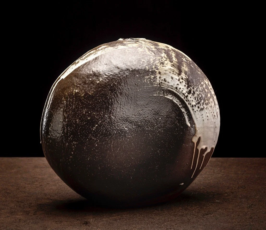 These stones suggest the stories found in river pebbles - of their geological origins and the river journey that has formed them. Iron stoneware with porcelain brushwork turns lustrous in areas with the natural ash glaze