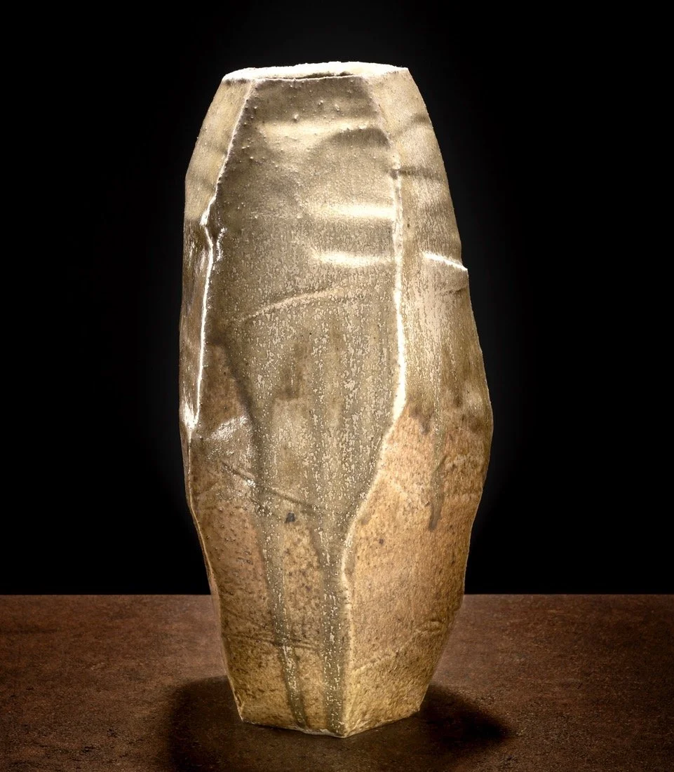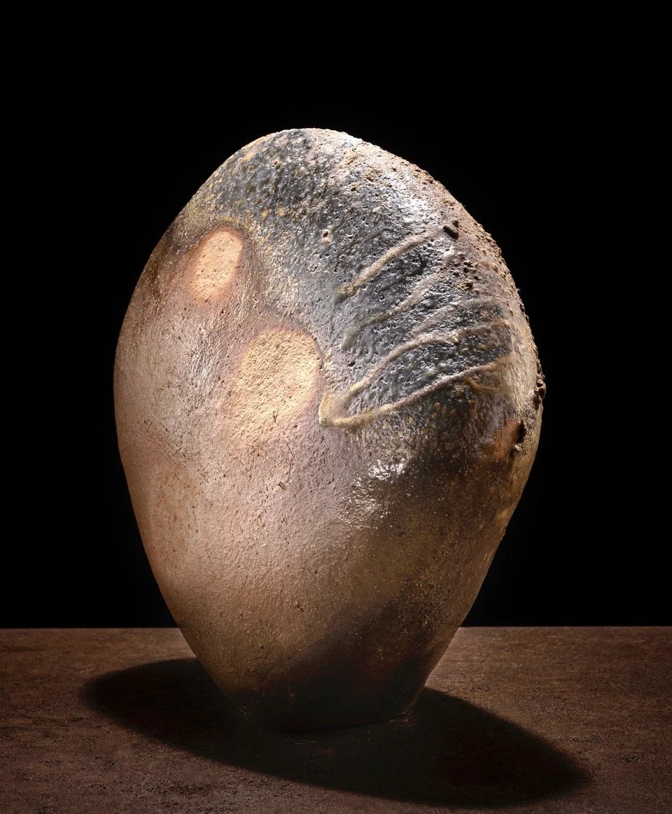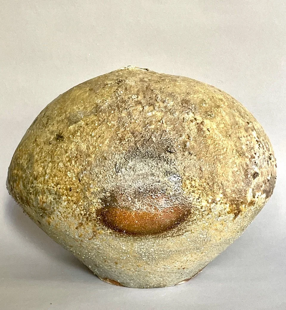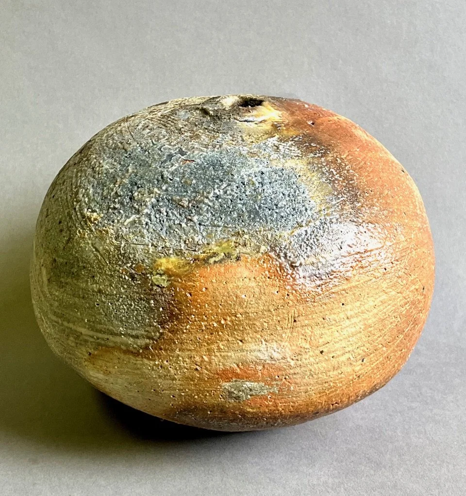 Glimpses of turquoise and greens in the natural ash glaze occur in high ember zones of the kiln where the work is buried for periods during the long firing