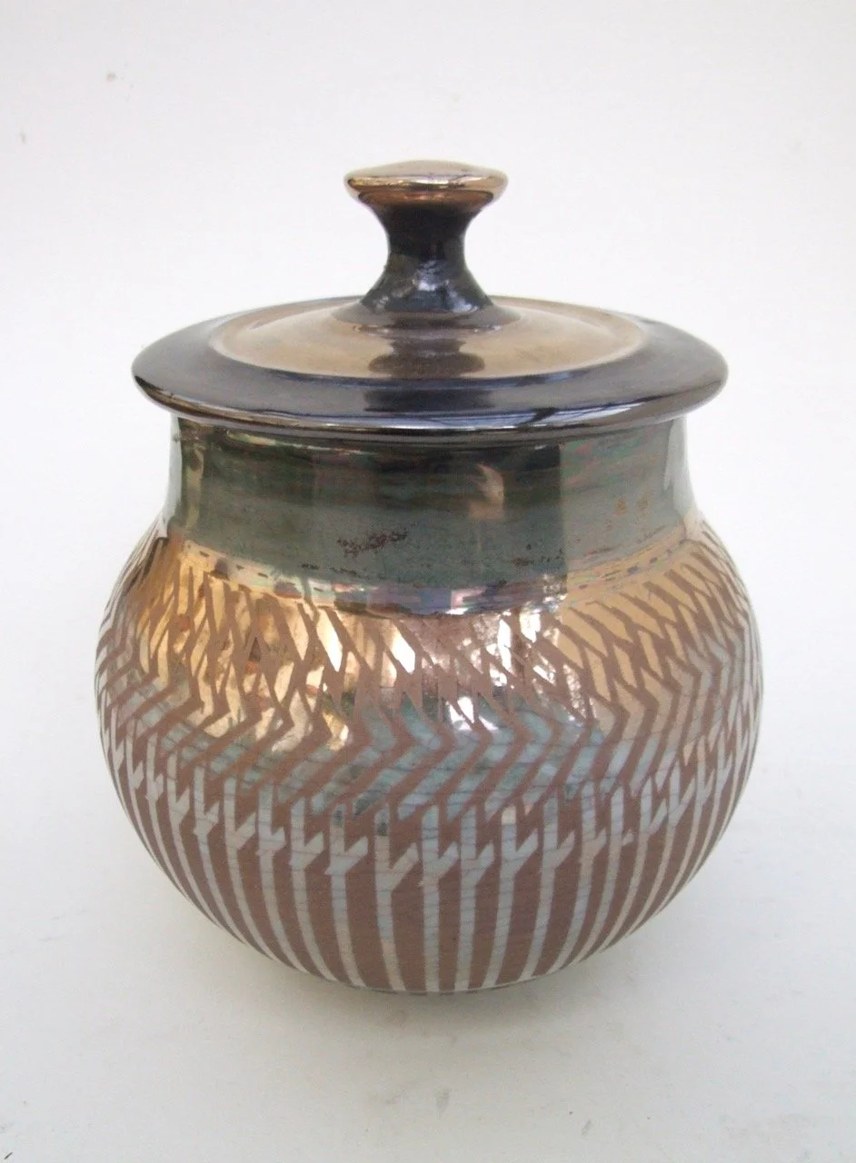 Due to faults in the lustre this pot was re-fired. I expected the sandblasted design to disappear but happily it did not, instead it became this delicate blue which I think is due to the high fired lustre