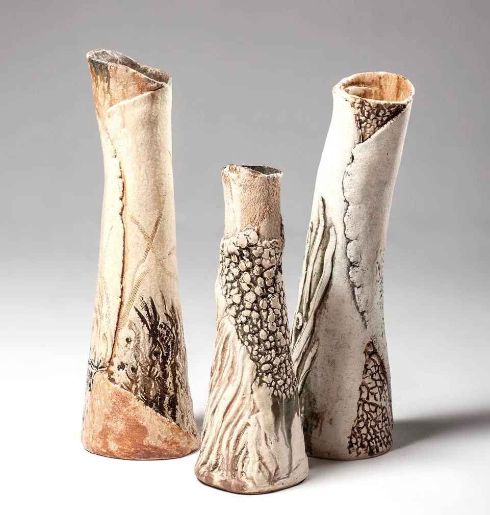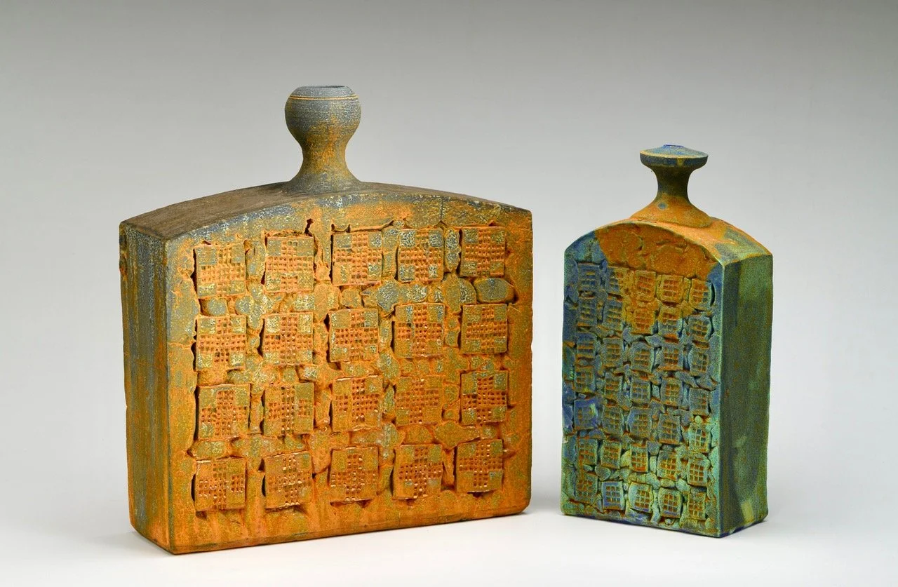 Hand-built, textured, ceramic forms, multi-glazed, mid-fired