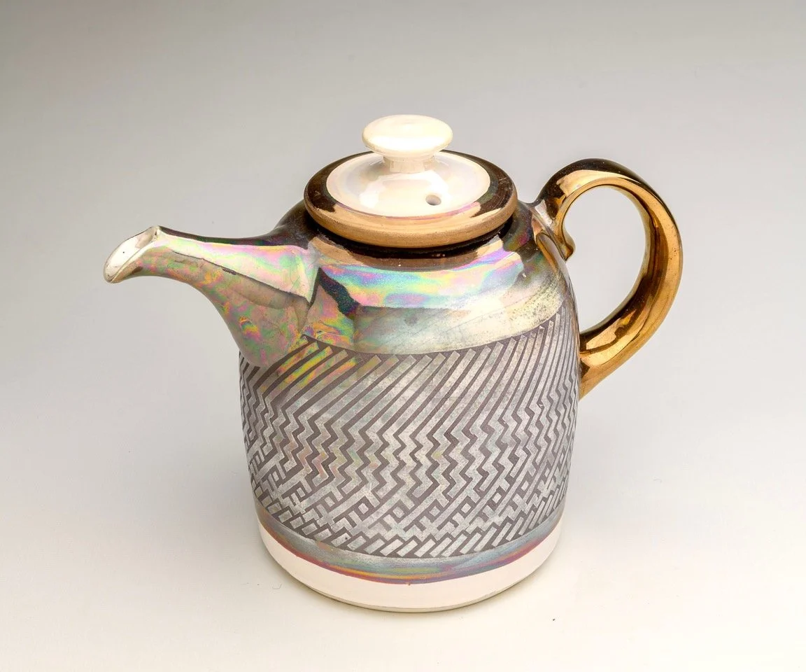 Teapot is functional, palladium lustre rubbed back, layered with opal lustre
