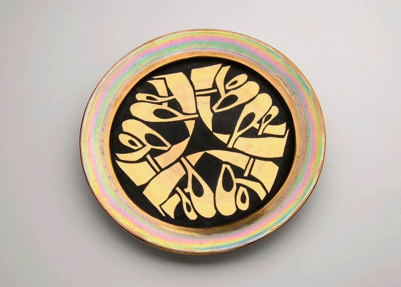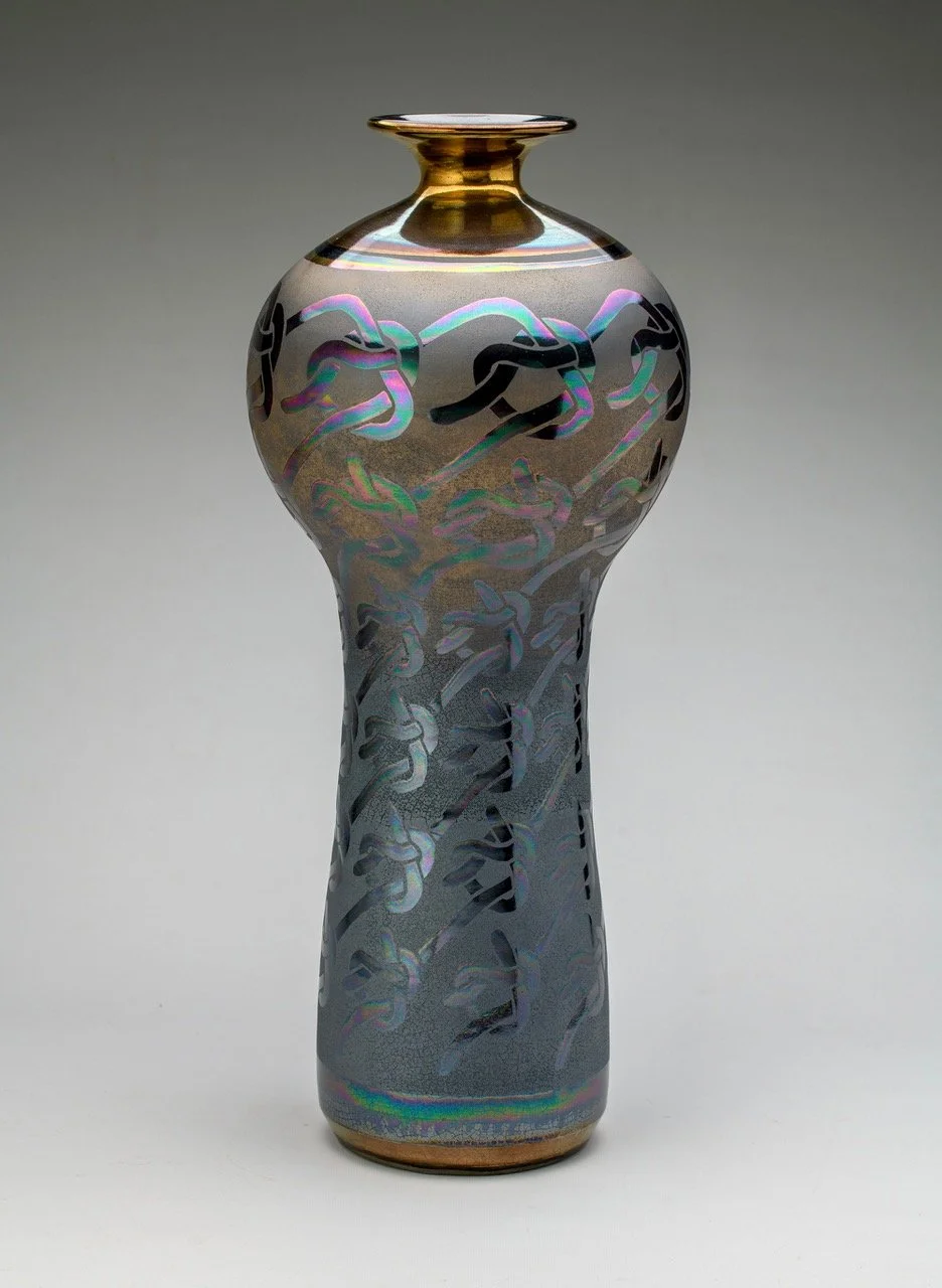 Stoneware, sandblasted clear glaze, gold, black and opal lustre, black stain