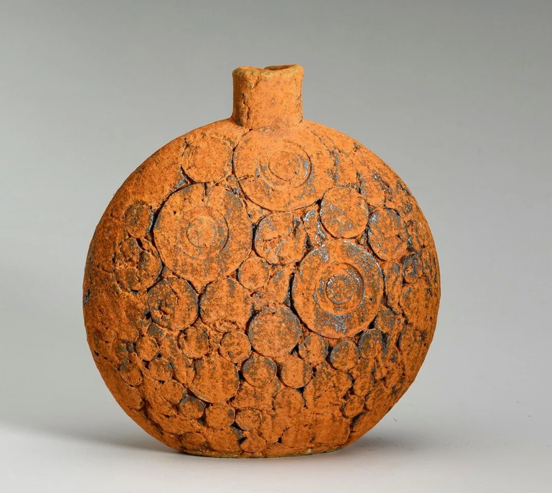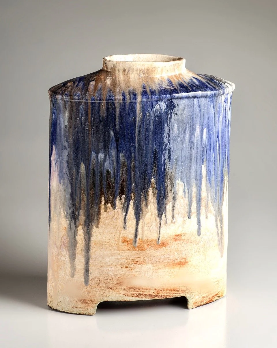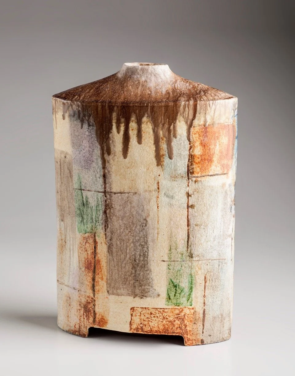 Large, hand-built flask-form, multi-glazed, multi-fired