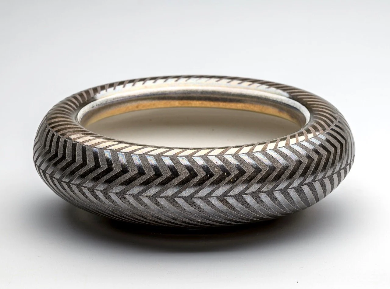Stoneware, sandblasted white glaze, layered palladium and opal lustre
