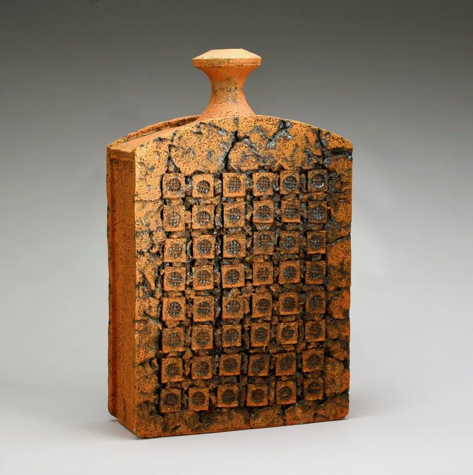 This handmade bottle contains constructed slabs and has been fired multiple times to gain the desired colours
