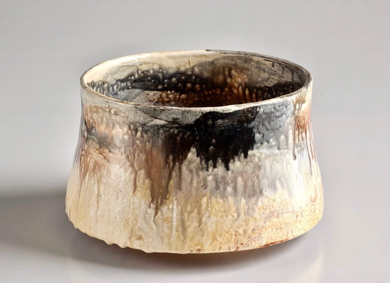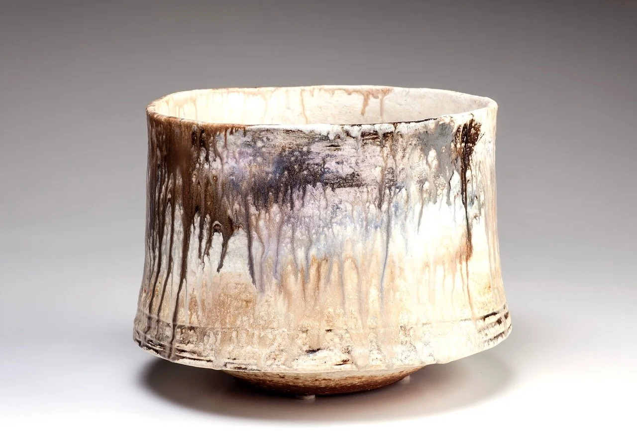 Hand-built, high-walled, ceramic bowl form, multi-glazed, multi-fired
