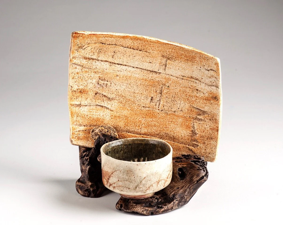 Ceramic, multi-glazed, multi-fired, found grey mangrove timber