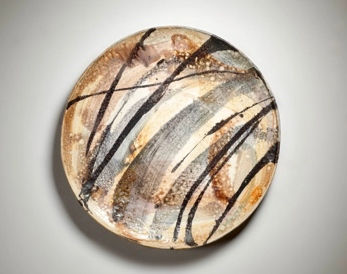 Large, hand-built, ceramic platter with foot, wall mount option, multi-glazed, mid-fired