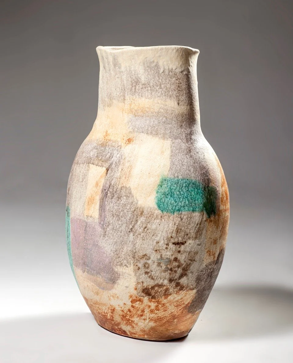 Large, hand-built, ceramic form with neck, multi-glazed, mid-fired