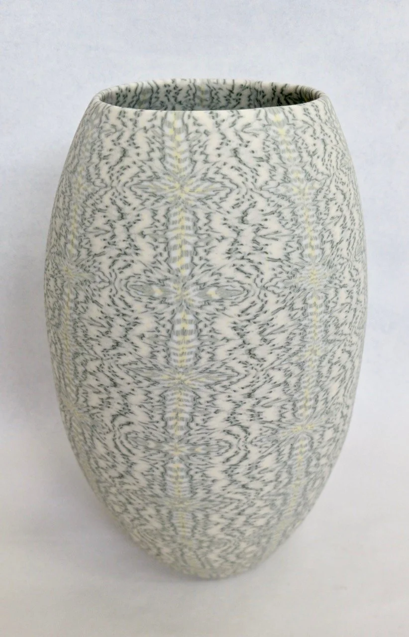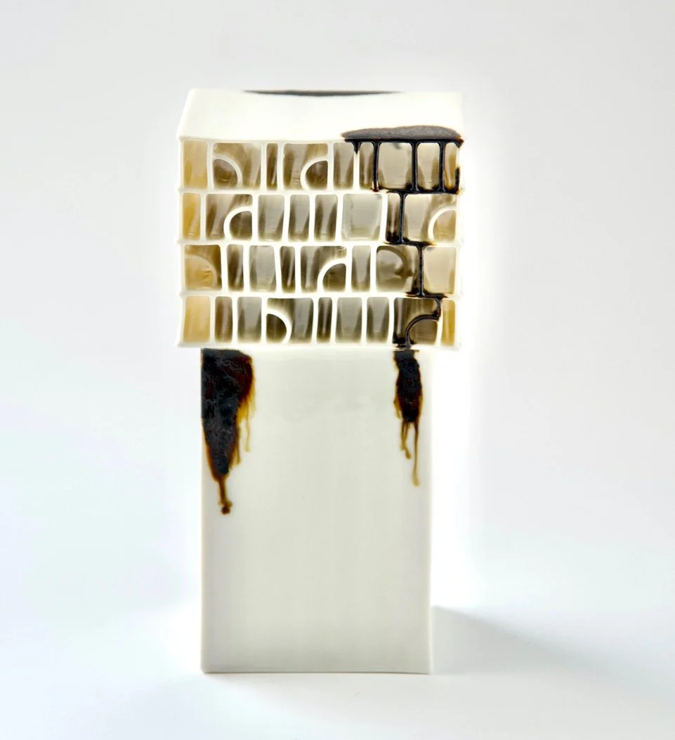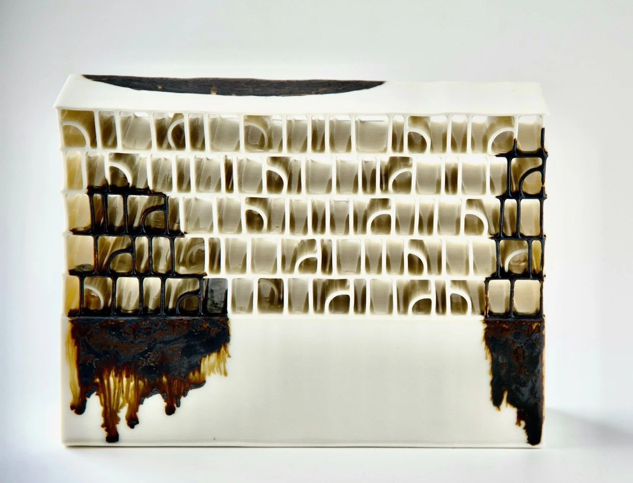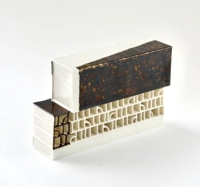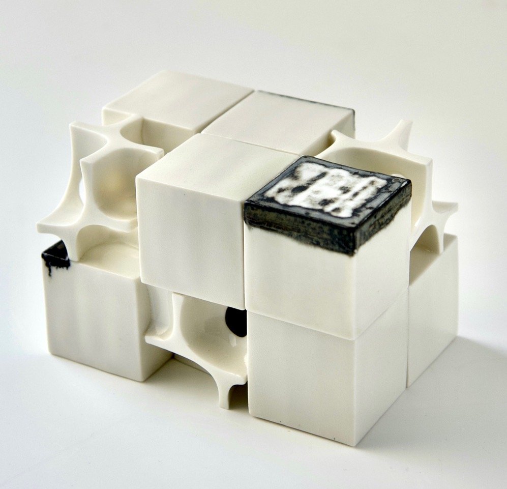 Porcelain, slip cast, slab-built, clear glaze, black stain