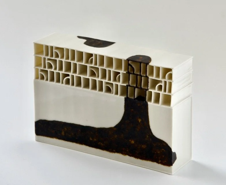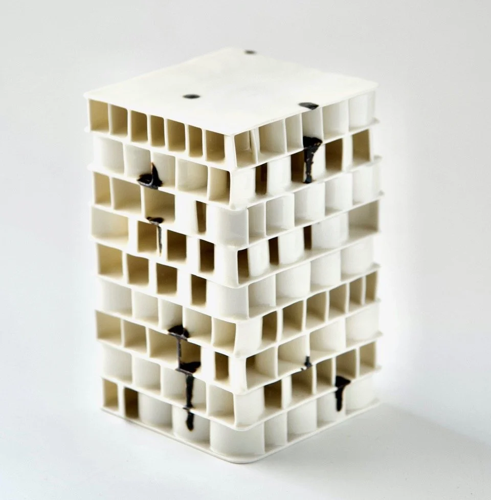 Porcelain, slip casted, slab-built, clear glaze, black stain